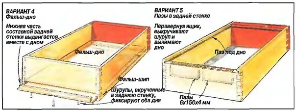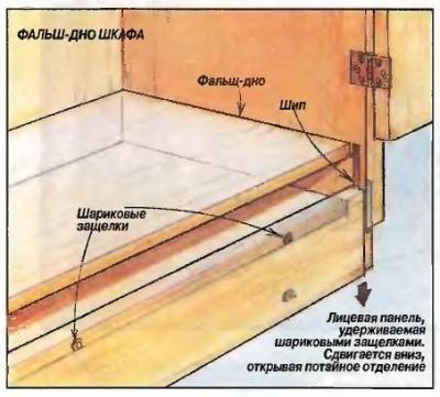Большинство встроенных книжных и даже кухонных шкафов стоят на цоколях высотой -100 мм под дном шкафа. Здесь можно разместить второе дно, либо закрепив его сзади на петлях, либо просто уложив по периметру на планки. Второе дно должно быть изготовлено из того же материала, что и шкаф, иначе из-за разности коэффициентов расширения материалов второе дно может заклинить. Второе дно должно быть устроено так, чтобы снять его можно было без
