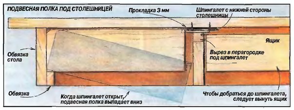 За обвязками или подстольем под столешницей имеется огромное пространство, идеально подходящее для размещения подвесных полок. Их можно прикрепить с одной стороны на петлях, а можно и просто укладывать на обвязку, фиксируя другой конец съемной планкой на нагелях. В нашем примере показан стол с центральным ящиком, имеющим потайную полку. Последняя слева опирается на обвязку, а справа зафиксирована шпингалетом. Убрав ящик, одной рукой поддерживают полку, а другой открывают шпингалет. Теперь свободный край полки можно опускать до тех пор, пока полка не соскользнет с обвязки.