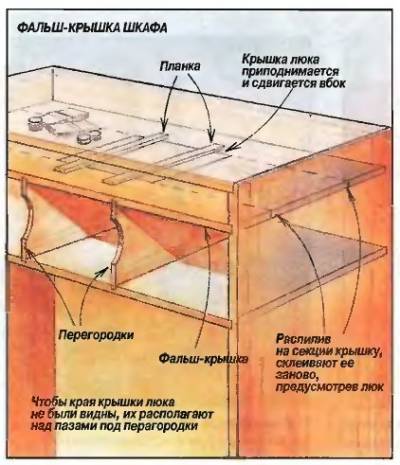 Для врезки люка размечают два паза, идущие перпендикулярно задней стенке в фальш-крышке, и распиливают крышку на три части. После этого распиливают среднюю секцию поперек по линии пазов. Теперь фальш-крышка состоит из пяти элементов. Склеивают две крайние секции и наружные детали средней секции, получив в центре проем. В него туго входит оставшаяся деталь. Кромки ее обрабатывают торцевым рубанком, а затем шурупами крепят к ней перпендикулярно текстуре две планки, выдающиеся с каждой стороны на 15 мм. Шлифуют крышку, выбирают в ней пазы и ставят на место вместе с перегородками. Люк можно приподнять кончиками пальцев, а внутрь он не провалится, так как опирается на перегородки и держится двумя планками.